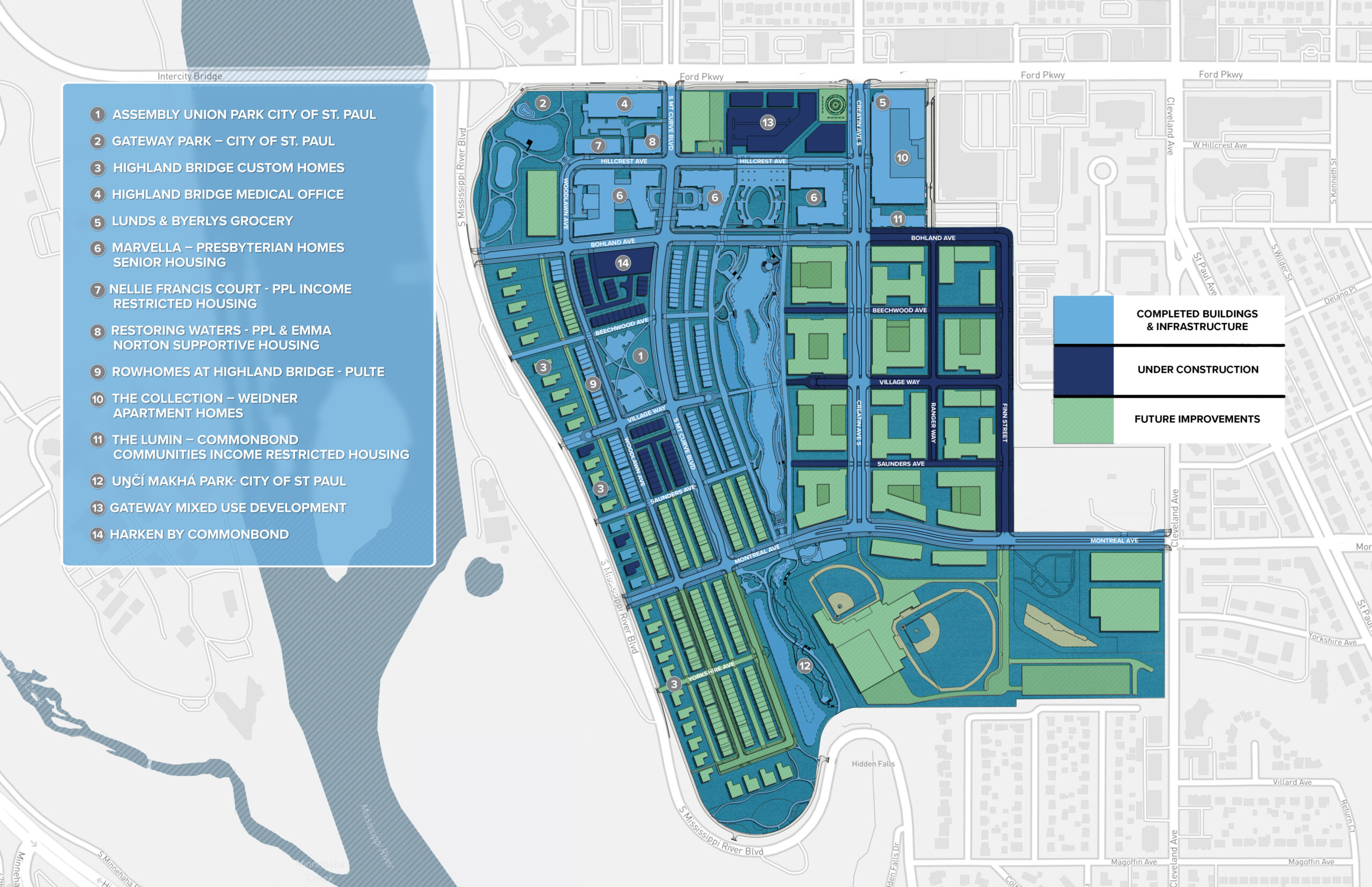 Highland Bridge will feature over 55 acres of public and open space, office and retail space, and residential options including affordable housing, senior living, market-rate apartments, single-family, condos and rowhomes. Gathering spaces throughout the development will attract and engage the community. Iconic features and amenities will create a distinct sense of place, built upon the spirit of Saint Paul. This mixed-use development provides something for everyone and reasons to visit and revisit this special place.